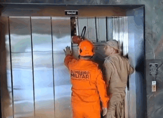 Segundo o Corpo de Bombeiros, foi necessário realizar a abertura forçada da porta do elevador para viabilizar o resgate